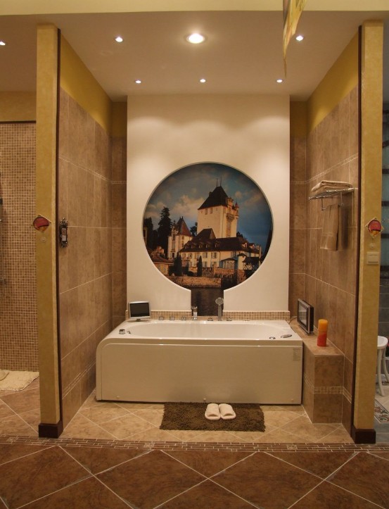 有些朋友在裝潢衛(wèi)生間的時候,喜歡在衛(wèi)生間里砌一個盆臺,盆臺高出地面一兩個臺階,然后將浴盆嵌在盆臺里,說老實話,這樣的格局非常漂亮,我本人也很喜歡。但還是有一個小小的建議要給您,最好不要在臥室所套的衛(wèi)生間里采用這種格局,因為根據(jù)中國傳統(tǒng)"家相學(xué)"的原理,衛(wèi)生間的地面不能高于臥室的地面,尤其是浴盆的位置不能有一種高高在上的感覺,五行學(xué)說認(rèn)為,水是向下流的,屬潤下格,長期住在被水"滋潤"的臥室里,容易發(fā)生內(nèi)分泌系統(tǒng)的疾病。如果您非常喜歡這樣的嵌入式浴盆,可以將它安置在另一間離開臥室較遠(yuǎn)的衛(wèi)生間內(nèi)。
