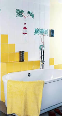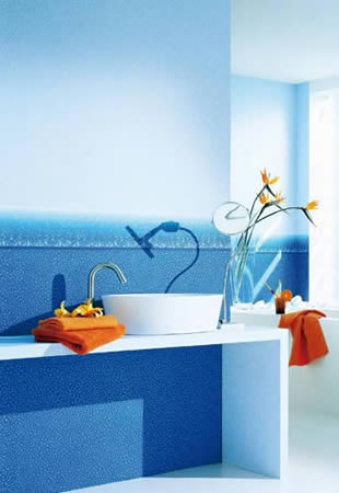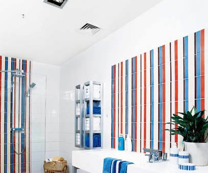 在封閉式設(shè)計(jì)的衛(wèi)浴間里,炫彩墻面以各個(gè)功能區(qū)的裝飾性主題墻的方式出現(xiàn)較好,可以是兩三種色彩的瓷磚組拼,也可以在局部區(qū)域貼彩色壁紙,馬賽克裝飾也是不錯(cuò)的點(diǎn)綴手段。