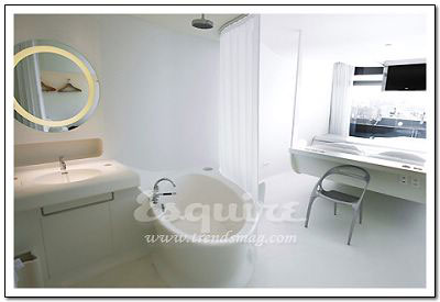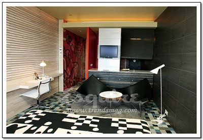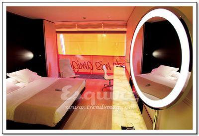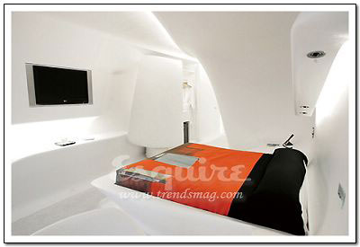 深處其中最大的感覺:流動(dòng)。Zaha.Hadid在這套房間中以數(shù)字設(shè)計(jì)的新發(fā)展為基礎(chǔ),用流暢但不規(guī)則的墻壁線條,體現(xiàn)了空間流動(dòng)性的特色,好像一個(gè)漂亮的模具。最不起眼的關(guān)鍵所在:電視機(jī)下的白色遙控器。它控制著屋內(nèi)所有內(nèi)嵌在墻壁內(nèi)的尖端數(shù)字設(shè)備,從激光燈到數(shù)字電視。最值得學(xué)習(xí)的搭配:橘黃色鑲黑的現(xiàn)代主義印花床單。