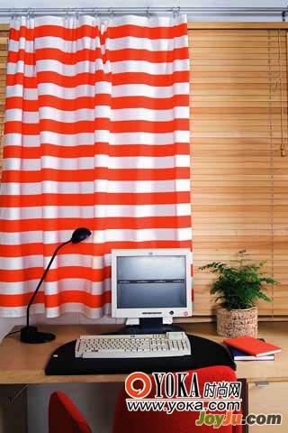 3.不同材質(zhì)組合運(yùn)用,不僅讓窗簾的形式更加豐富,也能更大程度發(fā)揮窗簾功效。書(shū)房的采光很重要,百葉簾便于調(diào)節(jié)書(shū)房?jī)?nèi)光線(xiàn)的強(qiáng)弱,但容易顯得單調(diào),加上橙紅色條紋垂簾,讓墻上的色彩更加活躍。