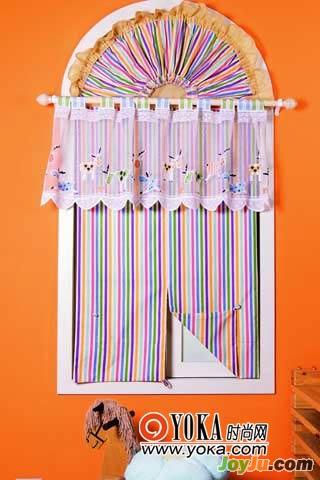 5.設(shè)計(jì)窗簾時(shí)要注意因勢(shì)利導(dǎo)、因人而異,根據(jù)窗戶(hù)的特點(diǎn)和使用者的性格特征來(lái)設(shè)計(jì)。此間兒童房的窗簾采用分體式設(shè)計(jì)。上半部圓弧形部分是用棉布做出自然褶度的異型窗簾,以魔術(shù)貼固定在窗框上,拆卸清洗均十分方便;下半部則是用彩色條紋棉布制成的卷簾,在卷簾下部開(kāi)了個(gè)高叉,兩邊則配以紐扣和紐孔。這樣,即使卷簾放下的時(shí)候,也能很方便地把卷簾一角掀開(kāi),以紐扣在相應(yīng)部分固定好,以獲取光線(xiàn),符合兒童的需要。
