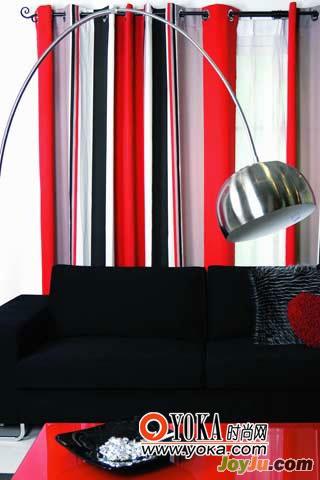9.窗簾的色彩可以跟室內(nèi)大型家具的色彩一致,也可以取若干種主要家具的色彩之和。客廳內(nèi)的組合沙發(fā)是黑色的,茶幾則是紅色的,而靠墊、果盤(pán)等小配飾也采用黑色跟紅色兩種主題色,因此,窗簾選用黑紅色條紋帆布質(zhì)地,強(qiáng)調(diào)室內(nèi)色彩主題,也將空間內(nèi)所有色彩元素統(tǒng)一起來(lái),和諧度因此大大增強(qiáng)。