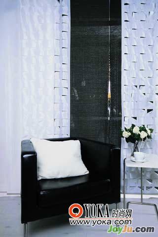 12.不同類(lèi)型的裝飾簾組合運(yùn)用,更有裝飾效果。此處為客廳跟陽(yáng)臺(tái)過(guò)渡的部分,因?yàn)殛?yáng)臺(tái)上另有窗簾,所以在遮光性上要求不高,只要能遮擋視線(xiàn)就可以。因此,采用兩層裝飾簾組合運(yùn)用的設(shè)計(jì)方案。黑色裝飾簾為基礎(chǔ)色,跟沙發(fā)色彩協(xié)調(diào)一致,鏤空白色簾則為加層,提升裝飾性,同時(shí)也跟邊桌色彩呼應(yīng)。