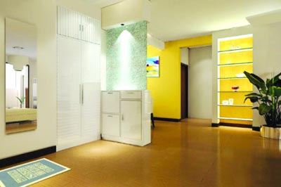 入口的正立面做了一個簡單實用的玄關柜,下面為鞋柜。鞋柜上方是塊透光不透明的裂紋玻璃,通過玻璃上面的射燈打下強光。