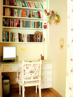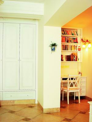 裝修后的立柱成了劃分客廳和書房區(qū)域的分界線,依立柱劃分左右兩個區(qū),左側(cè)是定做的長排大衣柜,柱子右側(cè)一個多平米的地盤則變成了"書房"。麻雀雖小五臟俱全,電腦桌、書架、吊柜全都有,當然了,家具尺寸都是依照電器尺寸量身定做的,不然哪里能活生生偷出1平米的空間呢?