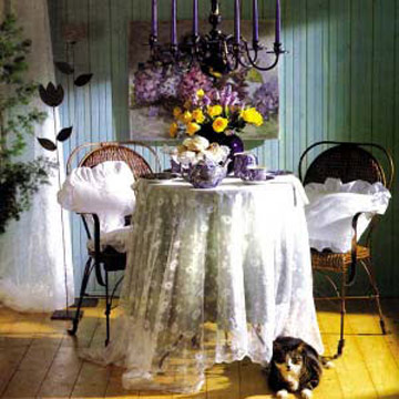 餐廳和居室用蕾絲裝飾后,看起來明快活潑,還很漂亮。窗簾如果遇到蕾絲,就會擁有變身的能量,當日光掠過,花邊會形成跳躍的影子穿過房間。漂亮的蕾絲花邊,還可以裝飾窗簾掛鉤,此外,它也可以用來保護光滑的木制表面。