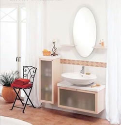 為了迎合人們希望盡可能充分利用空間的需要, 現(xiàn)在很多浴室家具不僅僅具有一項(xiàng)功能,例如圖中所示的坐椅,表面有可以打開的蓋子,蓋子一面是鏡子,可用于化妝,而椅坐里面還可以放一些零碎物品。高一些的帶抽屜的柜子也是如此。