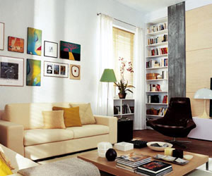 整個(gè)客廳沒有任何過于搶眼的顏色清新的米色、黃色、淡綠色在黑色單人坐椅和灰色木質(zhì)墻飾的點(diǎn)綴下更顯柔和電視機(jī)背后的墻面兩側(cè)裝有高達(dá)天花板的白色書架用于收納書籍,成為一面值得賞玩的背景墻,窗下空間也被充分利用,沙發(fā)背后的墻壁上,多幅收藏的裝飾畫在此集中展示,更是一種不著痕跡的收納妙法