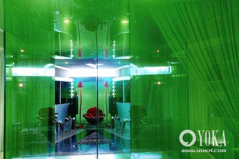 這種帶著跳躍性思維的布局方式在客人進門的第一眼就帶來了新奇,然而,真正使人感到有冷酷仙境之美的,是貫穿在房間中的那個綠色有機玻璃的走廊。它帶來了強烈的視覺效果,不禁使人對通道里隱隱約約的艷麗世界充滿好奇。