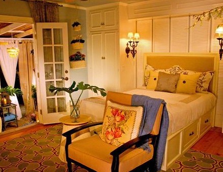 然后呢,把家具腦筋急轉(zhuǎn)彎,變身成另一種功能的裝潢!比如圖片中床后的墻,用的是廢棄的木頭窗櫺。