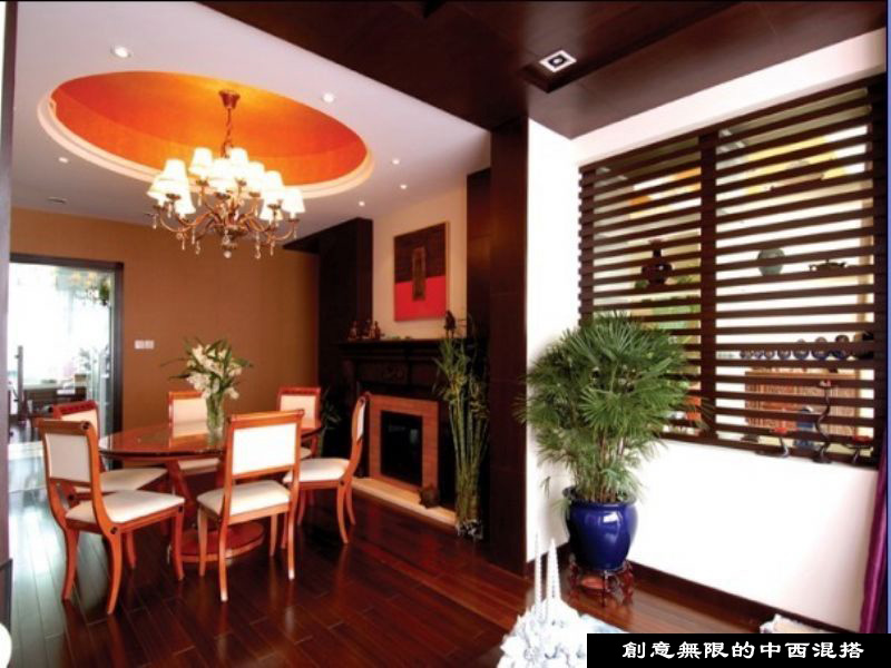 此套案例為中西混搭,脫去古板外衣的中式裝修,混入歐洲新古典的壁爐,餐桌椅,配以綠色植物,讓空間變得華麗而真實(shí)?! ?/p>