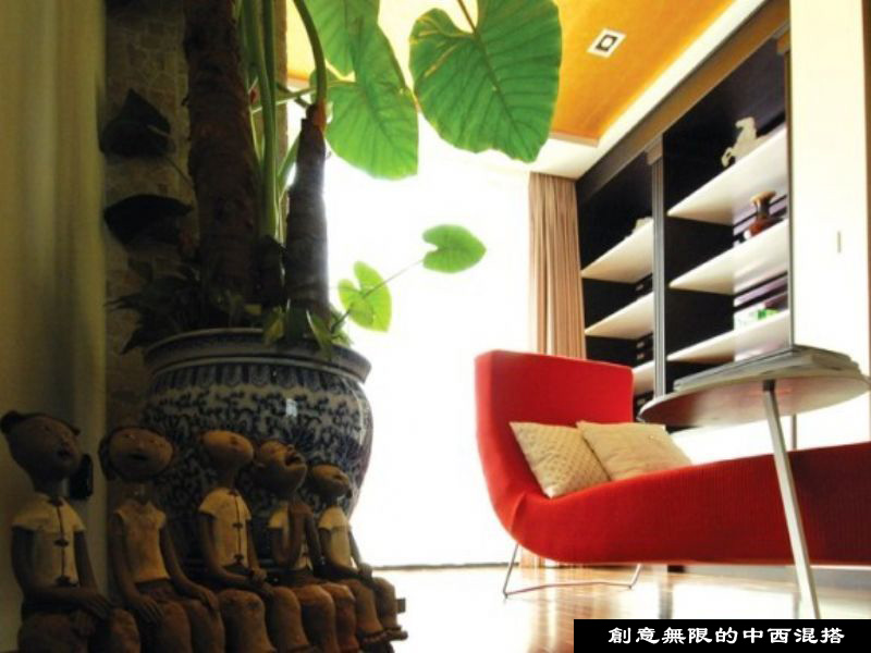 巨大盆栽下方擺放的人偶是主人外出旅行的收藏品,形色各態(tài),趣味橫生;這樣的紅色躺椅上讀書聊天都是那般的舒適。