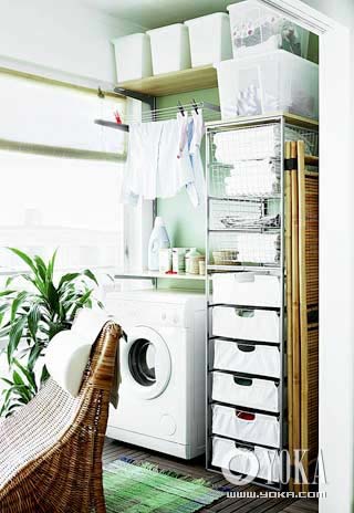 在決定怎么放置你的雜物之前,不妨提前做一個簡單的規(guī)劃,畫一張草圖,先分配好洗衣機、晾衣架等不能隨意移動的大件物品的位置,然后再分別安置可移動的小物件。洗滌劑、洗衣籃之類常用物品放在方便取用的地方,另外一些很少使用的雜物則可以放在密閉式儲物盒中,利于保存。