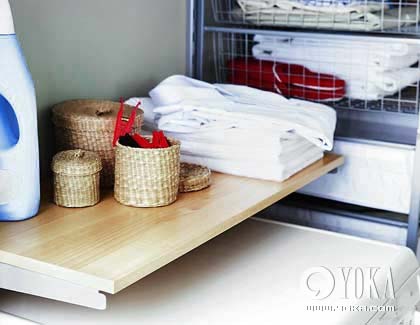 可以自由升降、調(diào)節(jié)高度的托架和擱板是洗衣區(qū)必備的收納法寶。擱板下放洗衣機,擱板上則可以擺放一些陽臺晾曬小工具。
