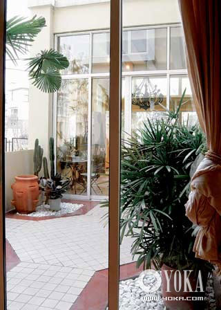 面積較大的室外陽臺鋪地材料可以豐富一些,整體瓷磚搭配局部卵石,營造天然趣味,植物也可以用一些形體較高大的,比如棕櫚。