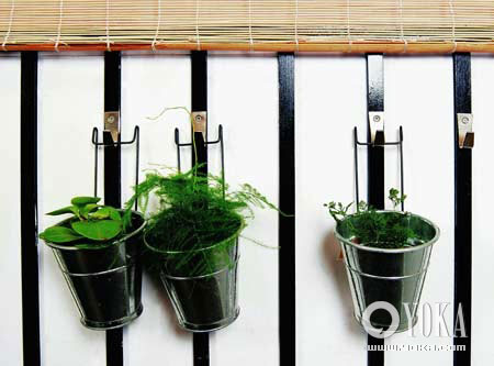 體積較小的小盆植物可以用一些懸掛式的花器掛在陽臺欄桿上,既節(jié)約了空間,也豐富了變化。