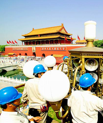 為配合長安街中段的道路南擴(kuò),在從西單北大街至人民大會(huì)堂西路南側(cè),路燈管理中心將29基華燈整體南移17.6米,新增華燈4基。值得一提的是,這4基華燈的樣式、高度、形狀與長安街上具有50年歷史的華燈一模一樣,長安街和天安門廣場上的華燈風(fēng)貌與最初設(shè)計(jì)得到了完美統(tǒng)一。