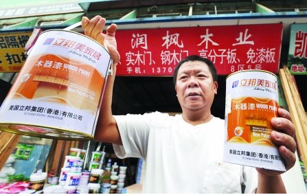 為給兩套新房裝修,經(jīng)熟人介紹,閆繼民認識了包工頭楊某。5月28日,在楊某的介紹下,閆繼民來到新白鶴裝飾材料市場魏某的店鋪里購買裝飾材料。由于對裝修材料一竅不通,也是出于對楊某的信任,閆繼民按照包工頭開出的材料單一口氣買了12881元的裝修材料。其中就包含8組“立邦美家居”的木器漆,每組價格300元。在木器漆的外包裝上注明“美國立邦集團(香港)有限公司”。