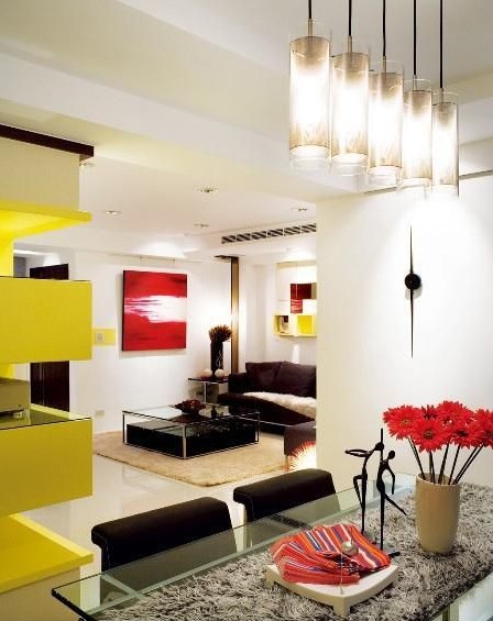 此案例大膽的運(yùn)用了跳色進(jìn)行設(shè)計(jì),搶眼的黃、紅,分散在黑白對(duì)比的空間中,黑色的紫壇木線(xiàn)條,從臥室的入口門(mén)框出發(fā),一路將電視墻面框架起來(lái),折出一個(gè)展示區(qū)塊,上下都是收納柜,展現(xiàn)強(qiáng)大的隱藏收納功能,并運(yùn)用隱藏式燈光,減輕其厚重感。