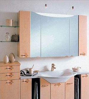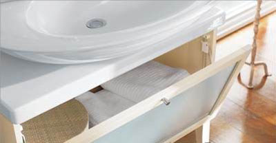 為了迎合人們希望盡可能充分利用空間的需要, 現(xiàn)在很多浴室家具不僅僅具有一項功能,例如圖中所示的坐椅,表面有可以打開的蓋子,蓋子一面是鏡子,可用于化妝,而椅坐里面還可以放一些零碎物品。高一些的帶抽屜的柜子也是如此。