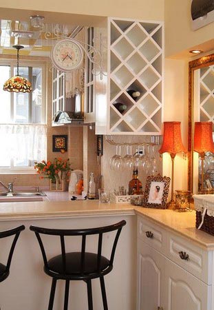 半敞開式的廚房間做了造型別致的吧臺(tái),吧臺(tái)邊上高高的坐椅,讓人覺得做飯也可以慢慢進(jìn)行,一邊做,一邊等。就像是某個(gè)下午煲一鍋養(yǎng)身湯,一邊等著湯沸,一喧拿本書靜等。