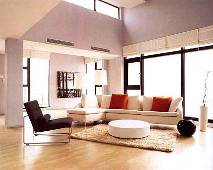 二、 裝飾材料與色彩設(shè)計(jì) 裝飾材料與色彩設(shè)計(jì)為現(xiàn)代風(fēng)格的室內(nèi)效果提供了空間背景。 首先,在選材上不再局限于石材、木材、面磚等天然材料,而是將選擇范圍擴(kuò)大到金屬、涂料、玻璃、塑料以及合成材料,并且夸張材料之間的結(jié)構(gòu)關(guān)系,甚至將空調(diào)管道、結(jié)構(gòu)構(gòu)件都暴露出來(lái),力求表現(xiàn)出一種完全區(qū)別于傳統(tǒng)風(fēng)格的高度技術(shù)的室內(nèi)空間氣氛。在材料之間的關(guān)系交接上,現(xiàn)代設(shè)計(jì)需要通過(guò)特殊的處理手法以及精細(xì)的施工工藝來(lái)達(dá)到要求。 其次,現(xiàn)代風(fēng)格的色彩設(shè)計(jì)受現(xiàn)代繪畫流派思潮影響很大。通過(guò)強(qiáng)調(diào)原色之間的對(duì)比協(xié)調(diào)來(lái)追求一種具有普遍意義的永恒的藝術(shù)主題。裝飾畫、織物的選擇對(duì)于整個(gè)色彩效果也起到點(diǎn)明主題的作用。