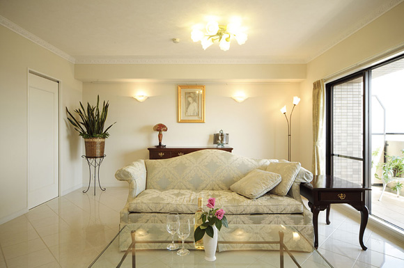 客廳內(nèi)裝修材料全是統(tǒng)一為白色,通過素材或間接照明等讓整個(gè)空間產(chǎn)生深淺有致的變化,豐富了原本單調(diào)的感覺和印象。