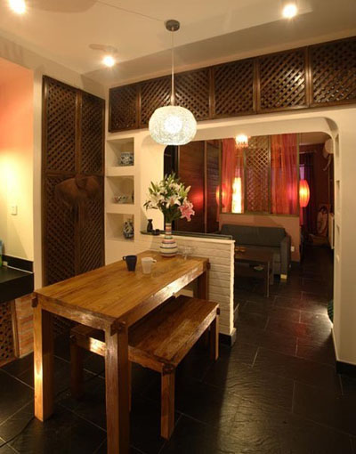 由于使用面積小,在設(shè)計(jì)上很是花了一翻功夫。在與業(yè)主充分溝通交流后,空間布局如何安排,雙方思路達(dá)成統(tǒng)一,真正行動(dòng)起來(lái),還是非常愉快的。打掉原進(jìn)入戶門(mén)的一道門(mén)連窗及窗下的墻體,并利用窗旁的部分承重墻和上面的混凝土梁,做成了一道弧型啞口,使餐廳與起居室保持通透的同時(shí),增加了餐廳采光和整體空間的通透性。是不是很出采?