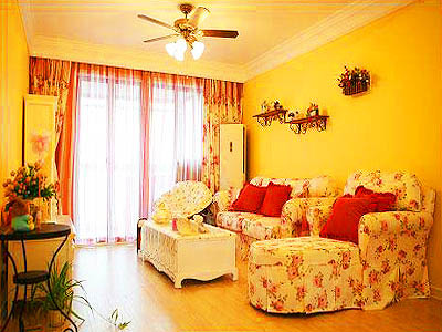 走直客廳,依然是米色的世界。窗簾與沙發(fā)布都是采用一個系列,打造了濃濃的田園風(fēng)。