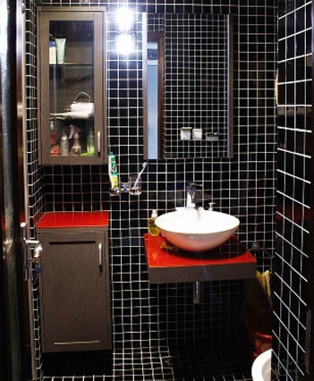 因此,設(shè)計(jì)裝修這一款衛(wèi)浴室的時(shí)候,正是緊緊圍繞這一主題展開(kāi)的。除了合理布局浴缸、坐便器與盥洗盆,減少洗浴、洗衣和化妝洗臉的相互干擾等因素外,在色彩上也有一定的個(gè)性。黑色的亮光玻璃馬賽克,中間點(diǎn)綴一點(diǎn)紅色,這樣形成既深刻又強(qiáng)烈的視覺(jué)感。同時(shí)使用大片的吊頂鏡面來(lái)增加空間感,衛(wèi)浴中間是一個(gè)特別大的白色浴缸。白色浴缸與黑色墻面和地板,形成黑白分明的反差,再加上紅色馬賽克的點(diǎn)綴,增加了幾分魅惑和迷離。