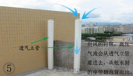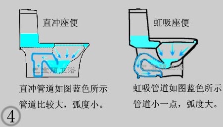 絕招四:如何區(qū)分虹吸和直沖,什么是虹吸呢?虹吸是依靠大氣壓強(qiáng),使液體從較高的地方通過(guò)虹吸管,先向上再向下流到較低地方的現(xiàn)象;直沖就是利用水的重力轉(zhuǎn)化為水的沖力,直接把臟物沖出去,如圖4所示?,F(xiàn)在的座便基本上都是虹吸的,直沖的款式比較少,虹吸能把上面漂浮的臟物吸出去,直沖就不行了,對(duì)于浮在上面的東西,只能多沖幾次,才能把它沖下去。碰見(jiàn)刮風(fēng)的天氣,風(fēng)從頂層透氣立管,灌進(jìn)來(lái),又從水封底的出口冒出來(lái),直沖的水封比虹吸低,水封的壓力也比較小,所以容易出現(xiàn)冒泡返味,虹吸就不會(huì)!如圖5。直沖的管道內(nèi)徑比較大,一般都在7cm以上,虹吸的管道內(nèi)徑國(guó)家標(biāo)準(zhǔn)要求4.1cm以上,各位TX請(qǐng)注意,座便管道的外徑一般都在8cm以上。下水口的直徑一般都要比管道的內(nèi)徑大,下水口大小跟管道大小沒(méi)有必然的聯(lián)系,所以不能根據(jù)下水口的內(nèi)徑和管道的外徑對(duì)管道大小進(jìn)行判斷,大家可以帶一個(gè)高爾夫球或者乒乓球?qū)艿纼?nèi)徑進(jìn)行一下簡(jiǎn)單的測(cè)試,把球放到管道里頭,前后翻動(dòng),看球能不能滾出來(lái),如果球出不來(lái),卡在里頭,很有可能管徑太小了,以后容易堵。如果管道里面的孔徑都在4.1cm以上,都能滿(mǎn)足一般家庭的使用,手紙都能沖得走,千萬(wàn)別扔報(bào)紙、衛(wèi)生巾、紙尿布哦,扔進(jìn)去了很容易堵在里頭的!總的來(lái)說(shuō),如果房子是90年代的話(huà),管道基本上是鑄鐵的,而且?guī)Х邓畯潯_x直沖好的,因?yàn)殍T鐵管道直徑只有10CM,在加上長(zhǎng)期掛臟、生銹,實(shí)際管道就沒(méi)那么大了。虹吸座便在管道順通的情況下靠吸力的,而直沖座是靠水的沖力。所以選擇直沖的會(huì)更好!還有如果生活中有習(xí)慣往座便里倒水或是扔手紙的話(huà),那就選擇直沖的,一般直沖座便的內(nèi)徑會(huì)比虹吸的大2CM;而且往直沖座便里倒少量水和大量水時(shí),水位是不會(huì)發(fā)生變化的,虹吸的就不行。虹吸座便更適合新房子用,因?yàn)楝F(xiàn)在管道都是PVC的,而且是不帶返水彎,虹吸沖水聲音比較小,現(xiàn)在的人都喜歡靜音的,這樣晚上上廁所時(shí)不會(huì)影響家里人,這是比較貼心的。而且虹吸座便款式比直沖的多,也比直沖的要好搞衛(wèi)生。