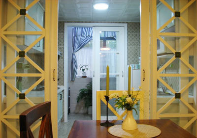 鏤空隔斷的另一面是餐廳。屏棄了田園風(fēng)的花色系,延用簡潔格調(diào)。