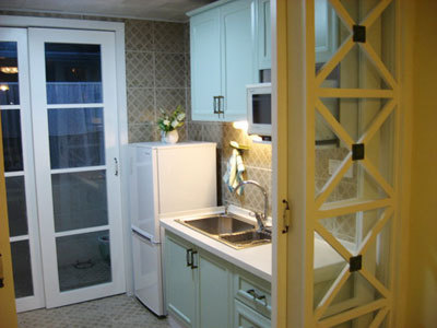 廚房在餐廳的另一端,采用玻璃門,另附一布簾將其隔開。