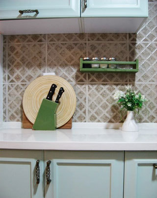 廚房間墻面磚及地面磚用了同一種,遠遠看起來以為是馬賽克,很有復(fù)古的感覺。
