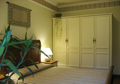 臥室空間較大,并做了飄窗,飄窗上的綠色植物為空間增添綠色。四門衣柜,乳白色做舊磨邊,在深色的大床之間,用兩色的床頭柜過渡,整個房間就會安穩(wěn)而不至于沉悶,富有層次的統(tǒng)一協(xié)調(diào)。