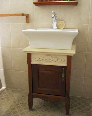 主臥衛(wèi)生間,效果立刻與從原先的現(xiàn)代田園感變成點點復(fù)古的簡歐風(fēng)格