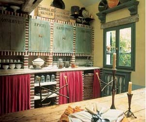 有效收納,只能算作是對(duì)廚房功能上的考慮。廚房和居室中其它區(qū)域一樣,還要有視覺的呈現(xiàn),這才能真正體現(xiàn)出設(shè)計(jì)的匠心所在。看這一處廚房,不難感受到它的歐陸鄉(xiāng)村風(fēng)格,這緣于它大面積原木的使用。粗礫的面板帶出原始的情懷,而吊柜與壁櫥的紅磚框架與白灰嵌線,表現(xiàn)出當(dāng)下十分流行的懷舊風(fēng)。另外我們可以注意到,這一間廚房特別講究視覺的完整性與開闊性,而這一特色的實(shí)現(xiàn)來自于吊柜的整齊柜門與壁櫥的紅色掛簾,將它們關(guān)閉或者掛上,呈現(xiàn)于你眼前則沒有了廚房通常難以回避的繁雜層次,而只是一副簡(jiǎn)潔的歐陸風(fēng)情畫。柜門的綠與掛簾的紅成了整體視覺設(shè)計(jì)上的點(diǎn)睛之筆,不僅讓這種復(fù)古的情調(diào)更加濃郁,而且還平添了幾分殷實(shí)之氣。