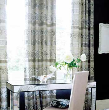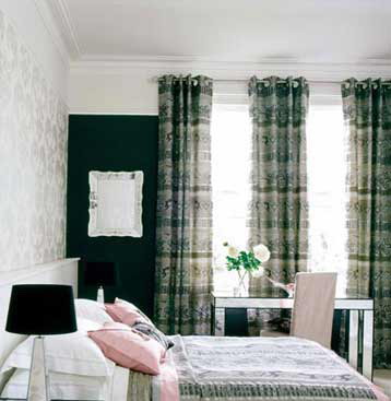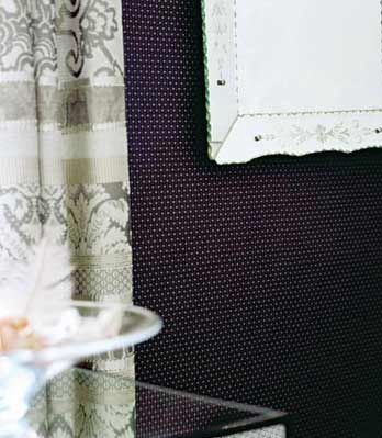 灰黑色條紋窗簾搭配凹凸紋理的黑色壁紙,層次分明。鏡面家具、裝飾品讓黑色墻面有了一些通透感。簡約而略帶復(fù)古圖案的布藝壁紙演繹著上世紀的優(yōu)雅品位,繁華而不失現(xiàn)代格調(diào)。