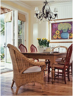 一張看似呆板的白底木面餐桌也能給餐廳帶來意想不到的活潑效果,簡單的長方桌搭配上藤條編制座椅,使餐廳充滿了原始自然的味道。