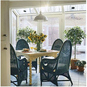 很多家庭將四季陽光房當(dāng)成臨時(shí)餐廳。陽光房的裝修和布置一般會(huì)隨季節(jié)變化而改變,因此沒有固定的風(fēng)格。隨季節(jié)和心情而定吧。圖中餐廳的柳條椅,各種盆栽,黃色的花束,為冬日的暖房帶了夏日的溫暖氣息。