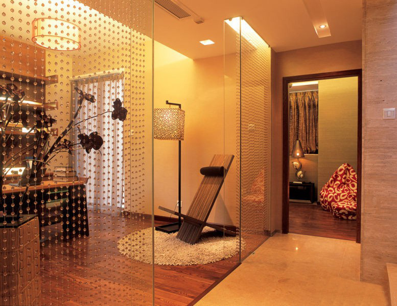 對(duì)于居家的要求,業(yè)主希望還是多些溫馨,這樣燈光及軟裝飾品就起到很大的作用了,這里的短毛地毯,水晶珠簾及木質(zhì)的讀物架很好的說明在