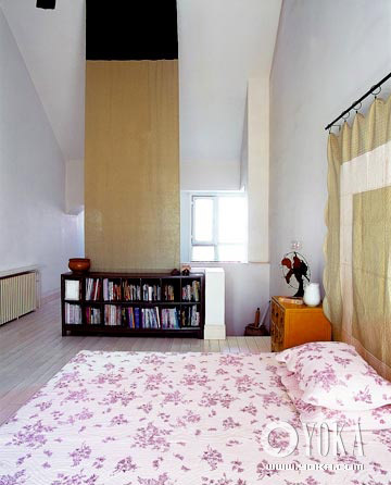 樓梯還沒有走到盡頭,頭剛剛探過矮矮的半墻,眼睛就已被一個開敞的“私密”空間吸引了。高懸的麻質(zhì)掛簾將四十多平方米的空間分割出東西兩側(cè)。 上海裝潢網(wǎng)