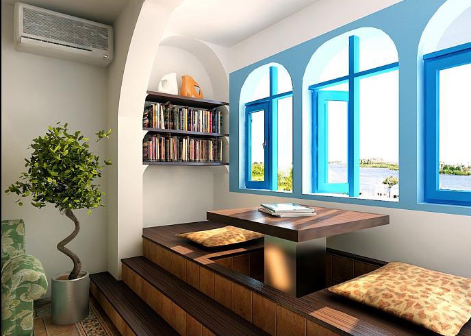 客廳是次設(shè)計的重點和亮點,首先在布局上把陽臺構(gòu)架抬高,做了一個可升降的臺面,升起可以看書上網(wǎng),放平被子一鋪就當(dāng)床,帶上一個粗狂而使用的書架,在配以藍(lán)色的拱形窗、臺面上斑駁的陽臺,讀書也變成了一種享受。一個空間幾種用處,可以做書房,亦可以朋友來訪時的臨時居住之所。