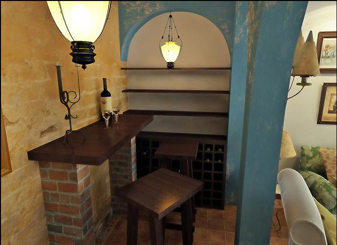 接著在進(jìn)門處設(shè)計了一個兩門的墻,目的在于將靠墻的吧臺和酒柜在視覺上和客廳有所區(qū)別。