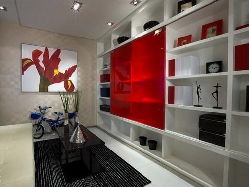 客廳、書房兩用。背景墻充分利用了墻體,增加收納、儲物功能。正面的墻壁都做了隔板、格架、書架之類的,整個色調(diào)也圍繞著紅白黑三大色塊為主。