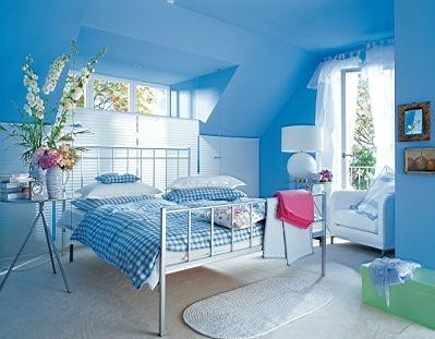 藍(lán)色清涼寧靜的氣氛令人感覺撫慰與放松,通過深淺不同的藍(lán)色參差的對(duì)比,以及格子與花朵圖案的微妙搭配,使臥室單純而不單調(diào),帶著海一般的夢幻感覺。