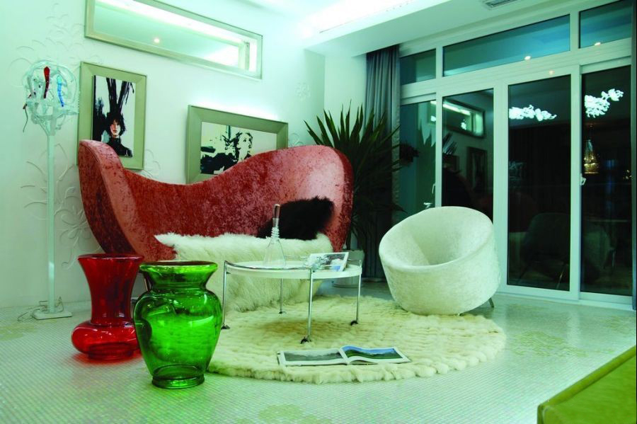 簾具備絲織品特色的光澤度,趨同又不同。紅色的沙發(fā)與白色的絨毛毯子將空間點綴時尚