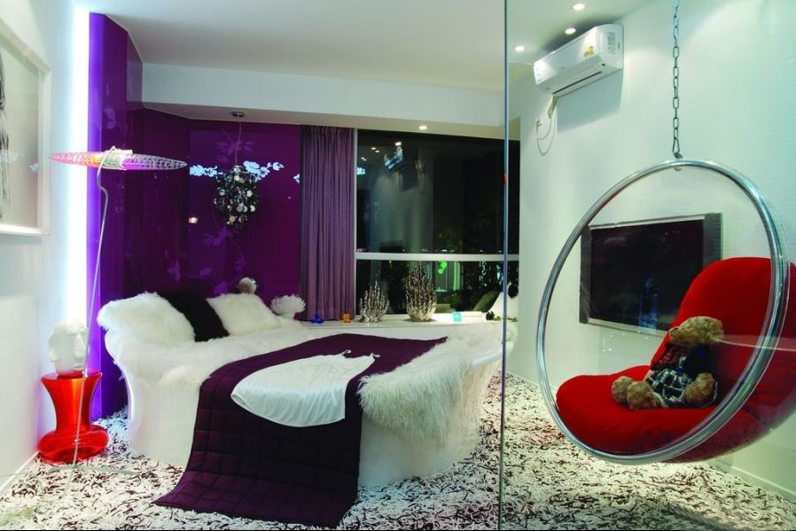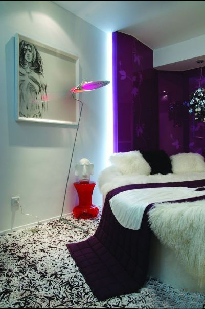 黑色與紫色演繹的亮面墻壁有一種迷幻的神秘感覺。
