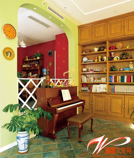 1 客廳和餐廳用青草綠色、紅色兩種不同的顏**分開來,交界處是一個拱形造型,把兩個空間諧調(diào)地連接在一起,中間放了一架木質鋼琴,上面擺滿了各式各樣的小飾品。 上海裝潢網(wǎng)