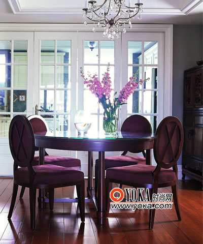 紫色的絲絨座椅為干凈明朗的餐廳增添了優(yōu)雅的浪漫氣息。